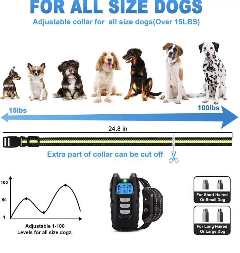 РЕГУЛЬОВАНИЙ НАШИЙНИК. Підходить для всіх порід собак вагою більше 5 кг Довжина електро нашийник для собак легко регулюється в межах 15-60 см. Також має два різних розміру контактів (довгі і короткі), щоб відповідати різній довжині шерсті собаки і торкатися її шкіри.